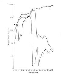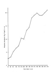 As expected, the value of nitrate (NO3-N) increases continuously. The average increase over 1986 is 0.617 mg/l/day, representing roughly 70% of the nitrogen added in the form of food. The concentration at the end of 1986 was 400 mg/l. This is fairly high.