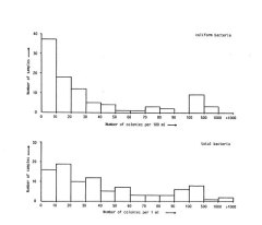 Results of the bacterial tests in 1986. The coliform counts are in number of colonies per 100 ml, the total bacteria counts in number of colonies per 1 ml. The total number of samples analyses N=95.